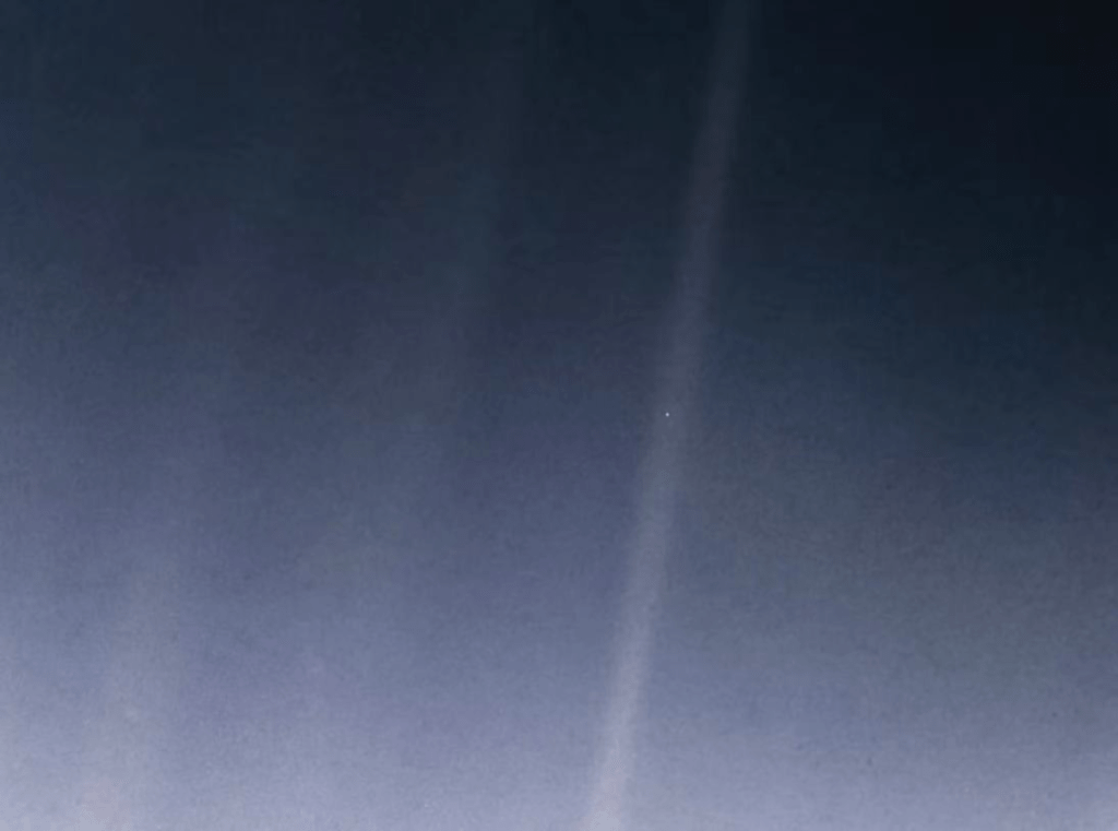 “现在,再看一眼那个小点。那就是这里、是家、是我们。那里住着所有你爱的人、所有你认识的人、所有你听说过的人、所有曾存在过的人。我们快乐和痛苦的总和,成千上万的宗教、意识形态、经济规律,每个猎手和小偷,每个英雄和懦夫,每个文明的创新者和破坏者,每个国王和农夫,每对恋爱中的情侣,每对父母,心存希望的孩童、发明人、探险家,每个道德典范,每个腐败的政客,每个“超级巨星“,每个“伟大领袖”,我们这个物种历史上所有的圣人和罪人,都在那个小点上,那是太阳射线下一粒悬浮着的尘埃。